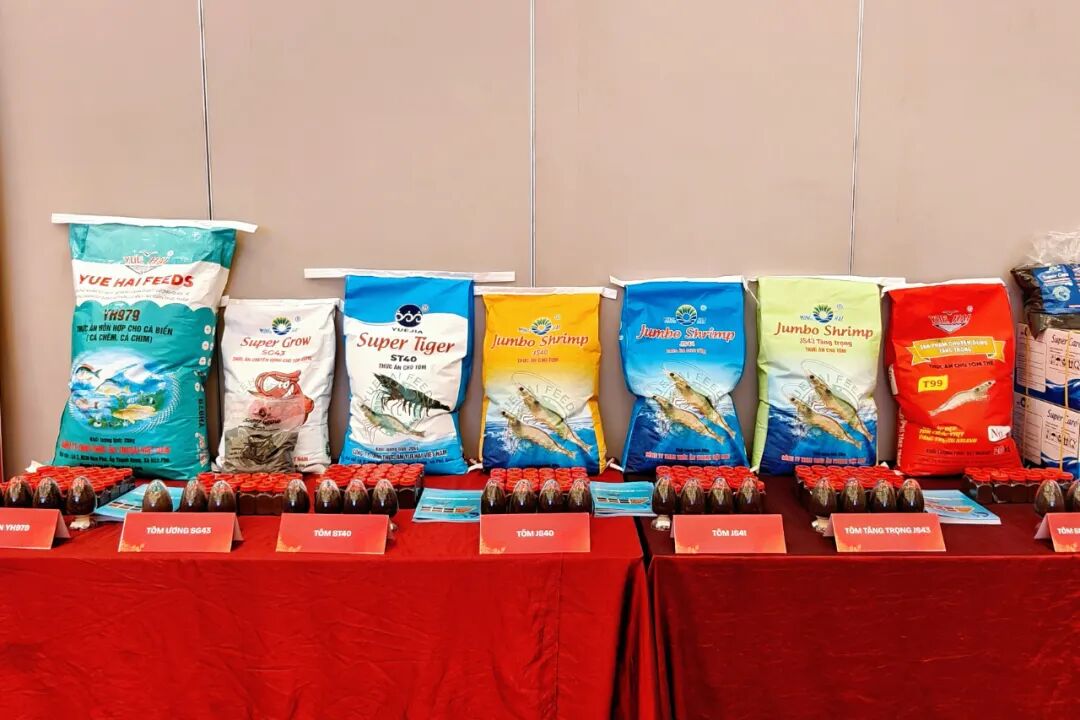 程博士表示,越南年平均气温约24℃,每年水产养殖适宜期超300天,养殖优势显著。此外,越南可养水产品种超300种,其中巴沙鱼产量占全球70%以上(年产量约200万吨),南美白对虾年产量约80万吨。随后,他介绍了粤海产品的研发技术体系并分享了不同产品的优秀效果,虾料方面,高位池南美白对虾亩产最高超1万斤,饵料系数仅1.1;斑节对虾亩产超5000斤,饵料系数1.65;加州鲈料当年头批鱼可控制料比1.1内,过冬鱼可控制在1.15内。还有生鱼、金鲳鱼、石斑鱼、巴沙鱼等产品数据,为现场客户了解粤海产品打下基础。